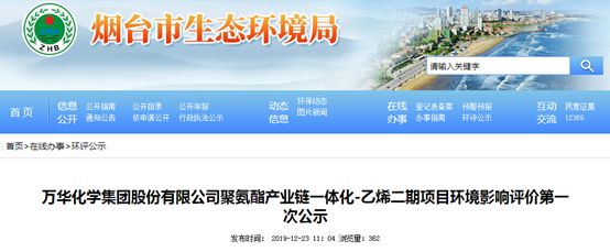 上月底,“萬華化學集團股份有限公司聚氨酯產(chǎn)業(yè)鏈一體化—乙烯二期項目”環(huán)境影響評價在網(wǎng)上公示。