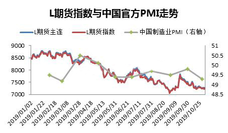 ????????PMI是經(jīng)濟先行指標中一項非常重要的附屬指標,具有其高度的時效性。目前全球已有20多個國家建立了PMI體系,有關(guān)機構(gòu)已開始建立全球指數(shù)和歐元區(qū)指數(shù),PMI指數(shù)及其商業(yè)報告已成為世界經(jīng)濟運行活動的重要評價指標和世界經(jīng)濟變化的晴雨表。如圖所以,2019年3月份回升到50的臨界值之上,對應(yīng)的PE價格在第一季度的震蕩;3月份之后PMI一路下行,PE價格幾乎同步跟隨。