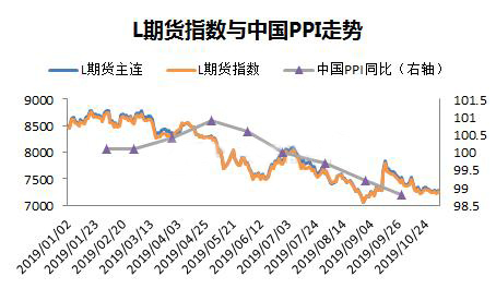 ????????2019年月初以來價格數(shù)據(jù)顯示,PE期貨和現(xiàn)貨相關(guān)度極高,幾乎同步漲跌,因此以下的分析,取期貨價格指數(shù)跟宏觀指標對比。