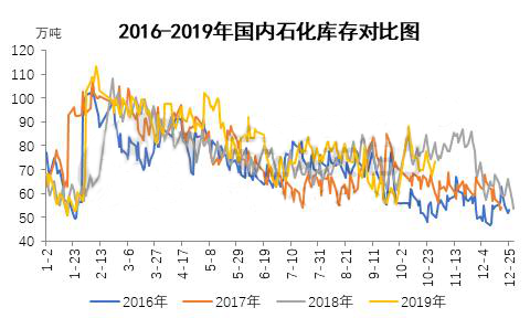 ????????2019年以來,從國內石化主要塑料產品庫存情況來看,一、二季度受需求低迷,國內產能不斷增加預期等因素影響,庫存高于往年季節(jié)性同期,但進入三季度,塑料下游主要需求數(shù)據(jù)向好,塑料制品產量與塑料制品出口量恢復增長,石化庫存去化理想,庫存陸續(xù)接近往年季節(jié)性同期水平。尤其8月底及9月份,國內石化庫存水平已經(jīng)明顯低于前三年歷史水平。進入10月份,由于國慶假期原因,庫存快速累積至歷史高位,但受中美貿易關系緩和,重啟貿易談判以及沙特突發(fā)“黑天鵝”事件利好原油等宏觀因素利好,石化庫存快速下降和,截止10月份下旬,石化庫存已經(jīng)低于2018年同期6-7萬噸。