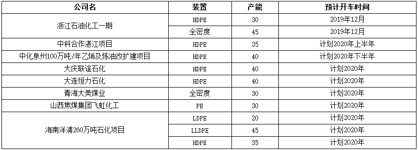 ????????2019年年內(nèi)中安聯(lián)合35萬噸LLDPE裝置已經(jīng)于7月30日開車生產(chǎn),寧夏寶豐二期30萬噸HDPE裝置已經(jīng)于9月27日投料生產(chǎn),算上初步計(jì)劃四季度投產(chǎn)的浙江石化來說,截止2020那邊預(yù)期投產(chǎn)裝置初步預(yù)計(jì)為390萬噸。