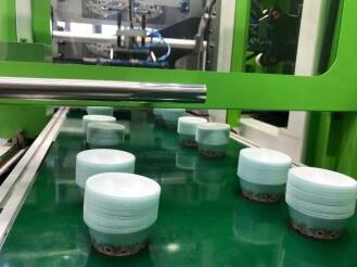 ????????伊之密PacPro薄壁包裝產(chǎn)品成型方案在現(xiàn)場也進行了展示,2.2秒內(nèi)高速成型一出四貼標(biāo)圓形容器。