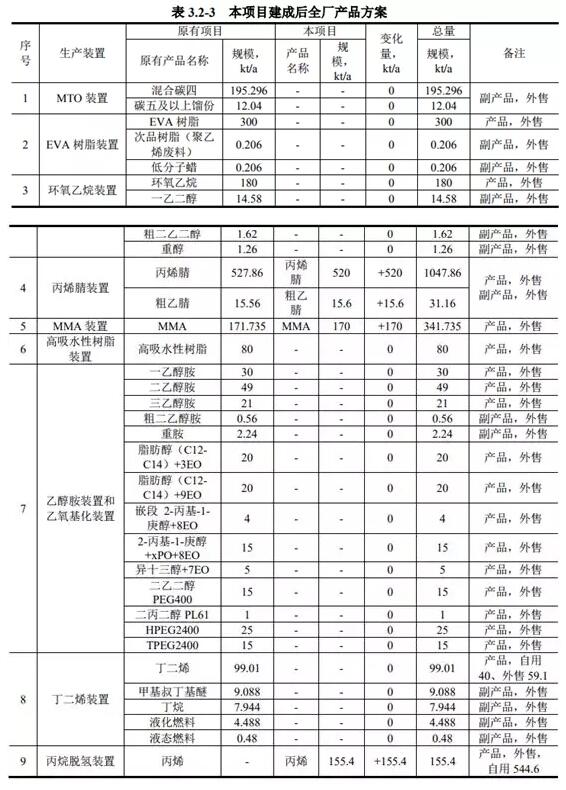 ????????除 360 萬 t/a 醇基多聯(lián)產(chǎn)項目部分裝置(甲醇制烯烴裝置、醋酸乙烯裝置、丙烯酸及酯裝置、丁辛醇裝置、乙丙橡膠裝置、H2/合成氣裝置)未建設(shè)外,其余項目均已建成并投入生產(chǎn),目前已建裝置均已通過竣工環(huán)保驗收。
