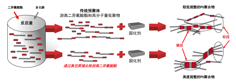 與相當?shù)某R?guī)預聚體相比,采用低游離預聚體生產(chǎn)的聚氨酯產(chǎn)品在硬段和軟段之間具有更徹底的相分離、更窄的分子量分布和更高的交聯(lián)度,從而使最終產(chǎn)品具有更優(yōu)異的性能。
