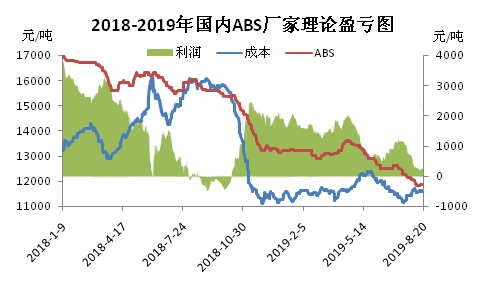 ????????自2019年4月中旬起,國內ABS市場開啟持續(xù)下滑走勢。截至8月20日,華東ABS市場國產料主流報盤在11450-12300元/噸,而國產ABS企業(yè)理論生產成本至11571元/噸。部分低端ABS已跌破理論生產成本線,高端料理論上盈利水平亦縮至低位。成本面支撐下,ABS市場表現出一定的抗跌性。