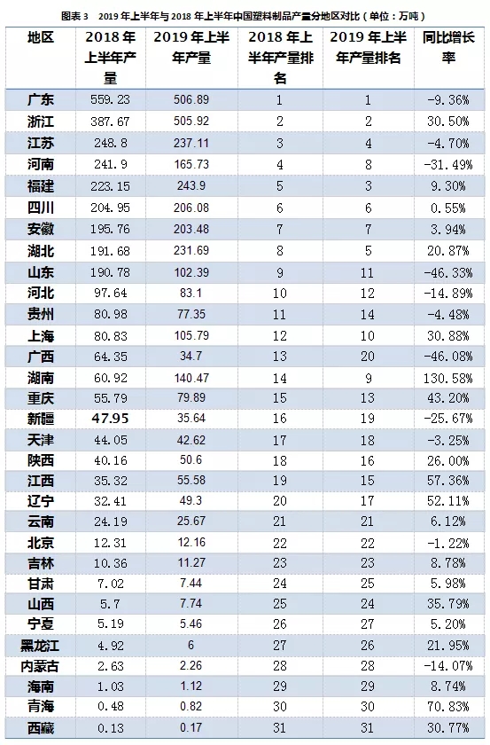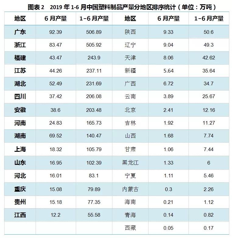 ????????1-6月塑料制品累計(jì)產(chǎn)量排名前五位(廣東、浙江、福建、江蘇和湖北)的總產(chǎn)量達(dá)到1725.51萬(wàn)噸,占到全國(guó)總產(chǎn)量53.3%。(按6月規(guī)模企業(yè)統(tǒng)計(jì))