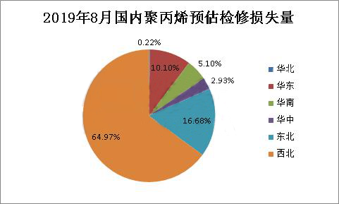 ????????由上圖可以看出,未來8月份國內(nèi)聚丙烯檢修裝置主要集中在西北、東北和華東地區(qū),西南地區(qū)暫無裝置檢修。西北地區(qū)檢修裝置主要有獨(dú)山子石化、延安能源化工、神華榆林和神華新疆等;東北地區(qū)大慶煉化雙線8月份按計劃檢修;華東地區(qū)常州富德常停裝置短期內(nèi)未有重啟計劃。