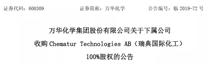 ????????2019年7月31日,萬華化學公告稱,萬華化學集團股份有限公司(以下簡稱“萬華化學”)境外全資下屬公司萬華化學(匈牙利)控股有限公司收購吉林市康乃爾投資集團有限公司(以下簡稱“康乃爾”)和歐美能源技術有限公司持有的Chematur Technologies AB (以下簡稱“瑞典國際化工”)100%股權。本次收購為有條件收購,總收購金額約等值人民幣925,445,229元。