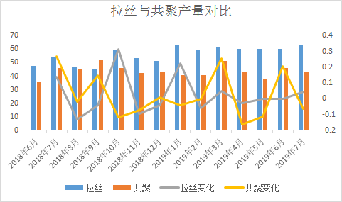 ????????拉絲價(jià)格走高除受期貨拉漲以外,粉料價(jià)格高位仍在支撐粒料價(jià)格高位不下的原因,裝置排產(chǎn)來看,部分停車裝置再現(xiàn)利好,新投產(chǎn)裝置量產(chǎn)偏少,拉絲體量較大,且多為快消品,剛需存在。