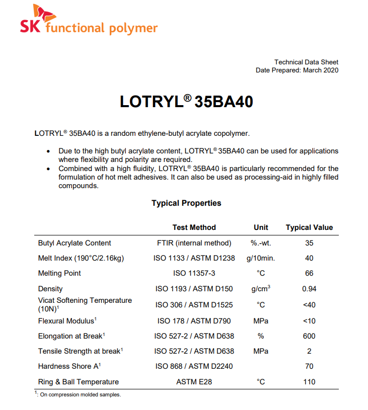 - 阿科瑪增韌劑相容劑EBA Lotryl 35BA40 物性表, 阿科瑪增韌劑相容劑EBA Lotryl 35BA40 產品參數(shù),阿科瑪增韌劑相容劑EBA Lotryl 35BA40 性能表,阿科瑪增韌劑相容劑EBA Lotryl 35BA40 出廠報告, MSDS,, 物質安全資料表, UL黃卡,{ SGS報告, RoHS, 食品級認證, NSF飲用水標準, 產品資料, 產品性能, 出廠報告, 原廠原包, 代理商, 熱變形溫度, 熔指數(shù), 流動系數(shù), 抗沖擊性能、沖擊強度, 低溫韌性、低溫抗沖擊性能, 熔體流動系數(shù)、熔體流動速率, 加工工藝、加工參數(shù)、加工溫度, 歐盟RoHS 德國FDA 美國FDA 日本FDA