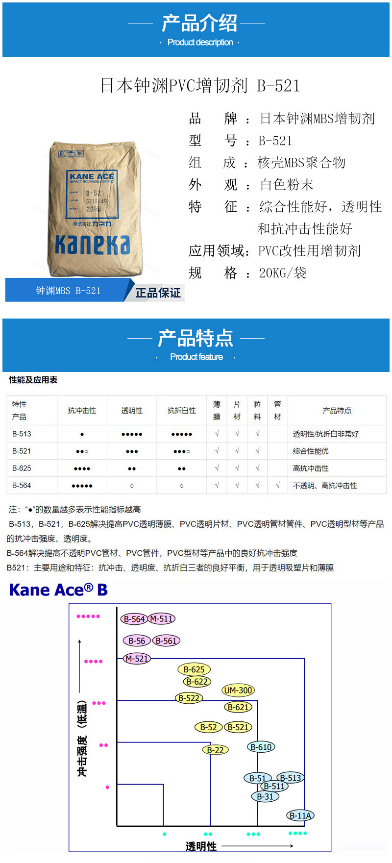 - 日本鐘淵mbs B521 透明抗沖擊綜合性能好 PVC改性增韌劑MBS521 物性表, 日本鐘淵mbs B521 透明抗沖擊綜合性能好 PVC改性增韌劑MBS521 產(chǎn)品參數(shù),日本鐘淵mbs B521 透明抗沖擊綜合性能好 PVC改性增韌劑MBS521 性能表,日本鐘淵mbs B521 透明抗沖擊綜合性能好 PVC改性增韌劑MBS521 出廠報(bào)告, MSDS,, 物質(zhì)安全資料表, UL黃卡,{ SGS報(bào)告, RoHS, 食品級(jí)認(rèn)證, NSF飲用水標(biāo)準(zhǔn), 產(chǎn)品資料, 產(chǎn)品性能, 出廠報(bào)告, 原廠原包, 代理商, 熱變形溫度, 熔指數(shù), 流動(dòng)系數(shù), 抗沖擊性能、沖擊強(qiáng)度, 低溫韌性、低溫抗沖擊性能, 熔體流動(dòng)系數(shù)、熔體流動(dòng)速率, 加工工藝、加工參數(shù)、加工溫度, 歐盟RoHS 德國FDA 美國FDA 日本FDA