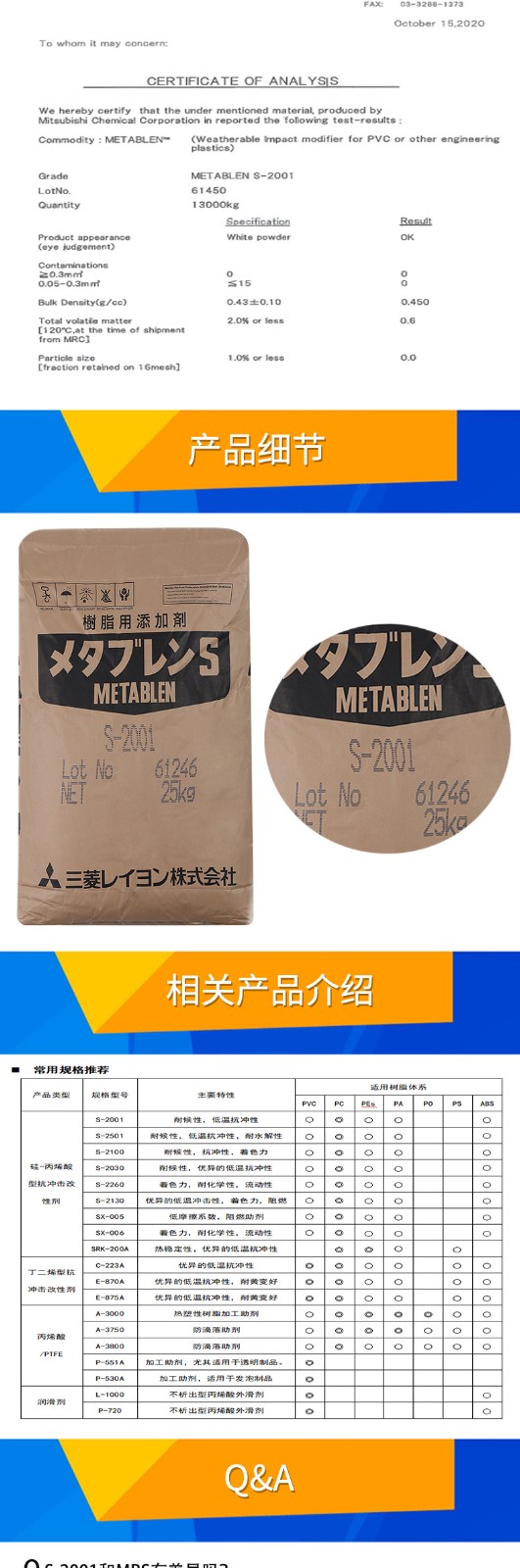 - 日本三菱S2001增韌劑 塑料改性 PC增韌耐候耐寒 麗陽(yáng)MBS S-2001 物性表, 日本三菱S2001增韌劑 塑料改性 PC增韌耐候耐寒 麗陽(yáng)MBS S-2001 產(chǎn)品參數(shù),日本三菱S2001增韌劑 塑料改性 PC增韌耐候耐寒 麗陽(yáng)MBS S-2001 性能表,日本三菱S2001增韌劑 塑料改性 PC增韌耐候耐寒 麗陽(yáng)MBS S-2001 出廠報(bào)告, MSDS,, 物質(zhì)安全資料表, UL黃卡,{ SGS報(bào)告, RoHS, 食品級(jí)認(rèn)證, NSF飲用水標(biāo)準(zhǔn), 產(chǎn)品資料, 產(chǎn)品性能, 出廠報(bào)告, 原廠原包, 代理商, 熱變形溫度, 熔指數(shù), 流動(dòng)系數(shù), 抗沖擊性能、沖擊強(qiáng)度, 低溫韌性、低溫抗沖擊性能, 熔體流動(dòng)系數(shù)、熔體流動(dòng)速率, 加工工藝、加工參數(shù)、加工溫度, 歐盟RoHS 德國(guó)FDA 美國(guó)FDA 日本FDA
