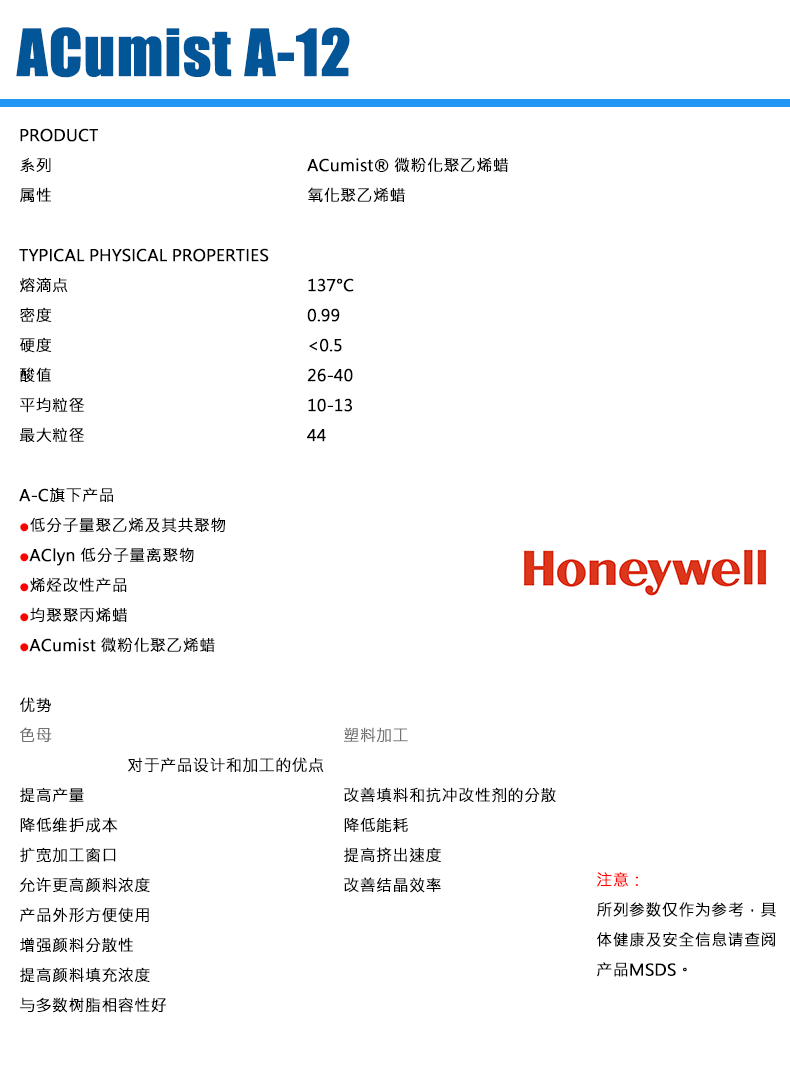 - 霍尼韋爾蠟粉 ACumist A-12 原裝進(jìn)口A12 物性表, 霍尼韋爾蠟粉 ACumist A-12 原裝進(jìn)口A12 產(chǎn)品參數(shù),霍尼韋爾蠟粉 ACumist A-12 原裝進(jìn)口A12 性能表,霍尼韋爾蠟粉 ACumist A-12 原裝進(jìn)口A12 出廠報(bào)告, MSDS,, 物質(zhì)安全資料表, UL黃卡,{ SGS報(bào)告, RoHS, 食品級(jí)認(rèn)證, NSF飲用水標(biāo)準(zhǔn), 產(chǎn)品資料, 產(chǎn)品性能, 出廠報(bào)告, 原廠原包, 代理商, 熱變形溫度, 熔指數(shù), 流動(dòng)系數(shù), 抗沖擊性能、沖擊強(qiáng)度, 低溫韌性、低溫抗沖擊性能, 熔體流動(dòng)系數(shù)、熔體流動(dòng)速率, 加工工藝、加工參數(shù)、加工溫度, 歐盟RoHS 德國(guó)FDA 美國(guó)FDA 日本FDA