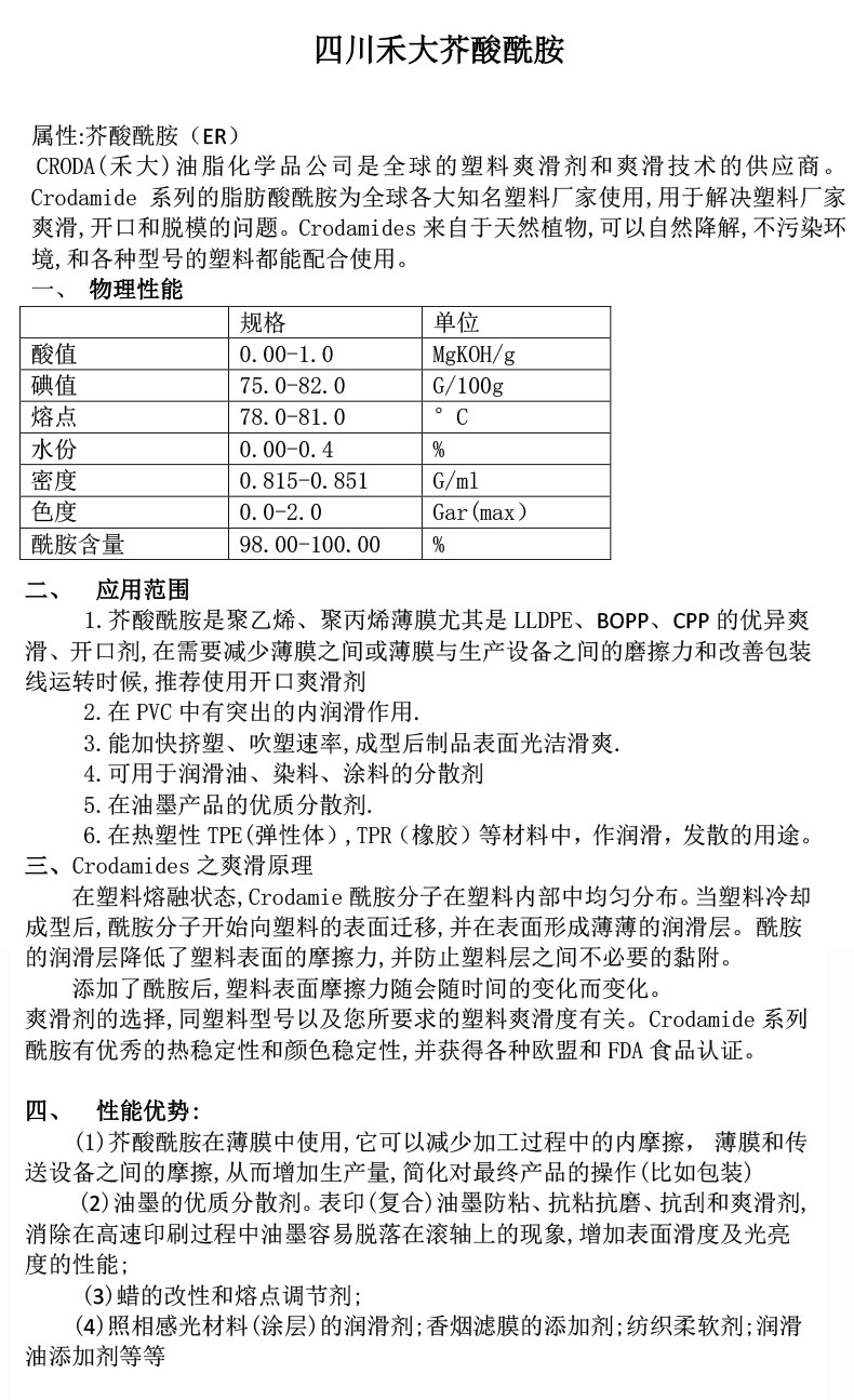 ● 芥酸酰胺是一種從植物油中精煉的具有低色度(90Pt-Co)和低水分含量(100mg/kg)的芥酸酰胺。芥酸酰胺具有優(yōu)良的爽滑性和良好的防粘連性能。加入芥酸酰胺并充分預(yù)混,可有效降低聚合物和設(shè)備、聚合物與聚合物間的摩擦力和附著力,使加工速度和產(chǎn)品質(zhì)量得到大副提升。