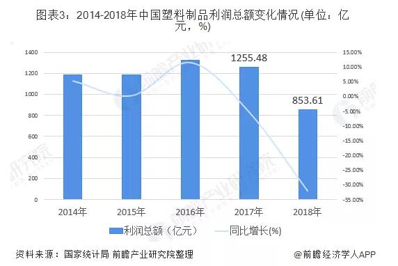 從行業(yè)利潤總額的情況來看,2014-2017年,中國塑料制品行業(yè)利潤總額呈波動(dòng)上升的趨勢。2017年行業(yè)利潤總額達(dá)1255.48億元,2018年行業(yè)利潤總額驟跌至853.61億元,同比上年下降至32.01%。