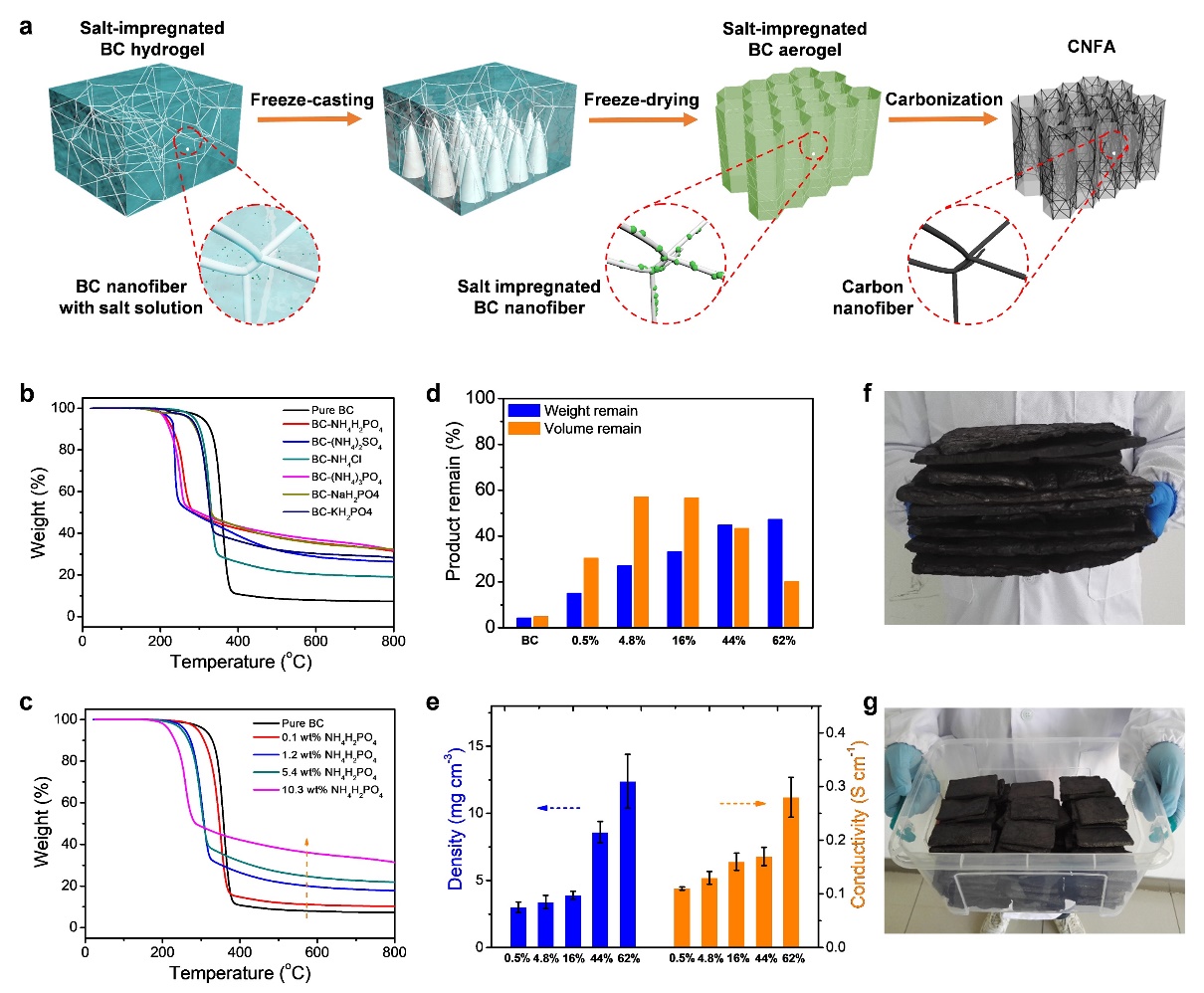 圖1、宏觀尺寸CNFAs的合成。(a)CNFAs制造工藝示意圖;(b)純BC和BC浸漬NH4H2PO4、(NH4)2SO4、NH4Cl、(NH4)3PO4、NaH2PO4或KH2PO4的TG曲線;(c)純BC和BC浸漬不同濃度NH4H2PO4后的TG曲線;(d)以純BC和BC為原料,在800°C下加入不同量的NH4H2PO4炭化制備CNFAs(NH4H2PO4的重量比分別為0.5、4.8、16、44和62 wt%);(e)1200 ℃下制備的CNFAs的密度和導(dǎo)電性;(f ~g)在800℃下制備的CNFAs照片,展示了其可以大規(guī)模制備。