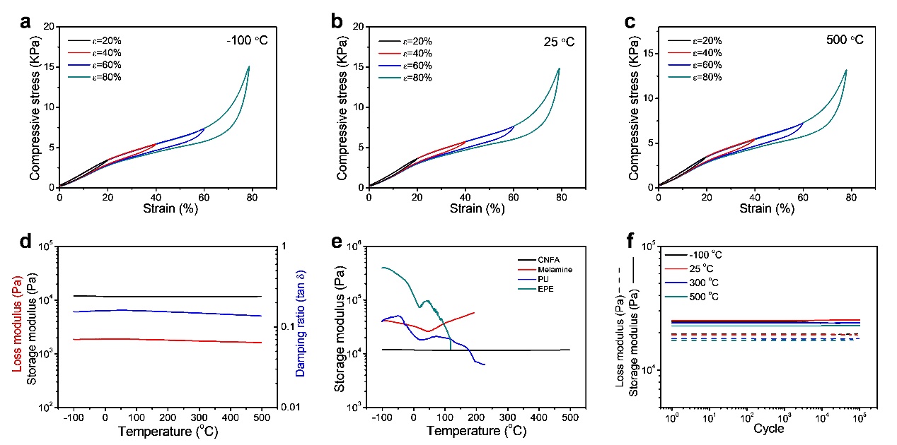 圖2、CNFAs在T = -100~500℃時(shí)N2中的熱力學(xué)穩(wěn)定的力學(xué)性能。(a~c)形變?yōu)?0%、40%、60%和80%時(shí)CNFAs的壓縮應(yīng)力-應(yīng)變曲線,溫度分別為:a)-100 °C、b)25 °C和c)500 °C;(d)CNFAs在T = -100-500℃時(shí)的粘彈性(儲(chǔ)存模量、損耗模量和阻尼比);(e)CNFA、三聚氰胺、PU和EPE泡沫的儲(chǔ)存模量隨溫度的變化;(f)不同溫度下CNFAs在1×105次循環(huán)中的儲(chǔ)存模量和損耗模量。