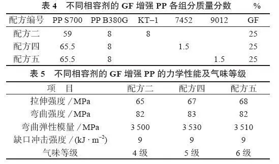 ????????可以看出,由于KT-1為熔融接枝的PP-g-MAH,因其接枝率不高(一般為0.8%),需要的用量大,加之其單體殘留多,因此材料氣味等級低。