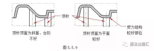 ????????(3)避免跨臺(tái)階或在斜面上設(shè)置頂針,頂針頂面應(yīng)盡量平緩,頂針應(yīng)布置于膠件受力較好的結(jié)構(gòu)部位。如圖5.5.9所示。