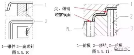 ????????(4)在膠件較深的骨位(深度≥20mm)或難于布置圓頂針時(shí),應(yīng)使用扁頂針。需要使用扁頂針時(shí),扁頂針處盡量采用鑲件形式以利于加工。如圖5.5.10