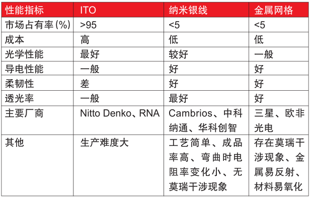 ????????納米銀線是一種直徑在納米范圍(一般在20-100納米之間)、長(zhǎng)度沒(méi)有限制的金屬銀一維纖維。納米銀線具有體積小、比表面積大、良好化學(xué)性能和催性能、導(dǎo)電性能、抗菌性能和生理相容性,具體如表4所示。納米銀線的生產(chǎn)方法有:模板輔助、多元醇、光波輻射、軟化學(xué)溶劑熱等,多元醇法由于操作簡(jiǎn)單、生產(chǎn)效率高、成本低廉成為當(dāng)前主流生產(chǎn)方法,缺點(diǎn)是產(chǎn)品濃度低。例如納米銀線可以生產(chǎn)透明柔軟塑料導(dǎo)電膜,具體結(jié)構(gòu)為基材為PET薄膜,涂覆層為納米銀線分散液,表層為丙烯酸保護(hù)涂層?;臑橹螌?,中間涂層為透明導(dǎo)電層,保護(hù)層為保護(hù)銀不被氧化降低導(dǎo)電性能,主要替代ITO和金屬網(wǎng)透明導(dǎo)電薄膜。