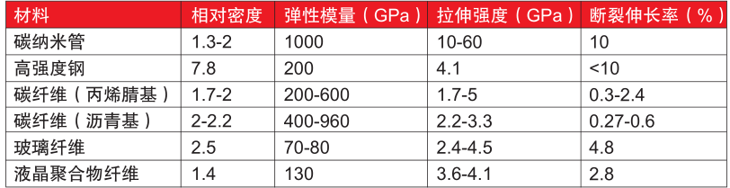 ????????碳納米管是一種理想的一維模型材料,巨大的長(zhǎng)徑比使其具有類似碳纖維的性能,即高強(qiáng)度、高模量。其重量為鋼的1/6,強(qiáng)度為鋼的100倍,比強(qiáng)度為鋼的600倍,具體見(jiàn)表2所示。