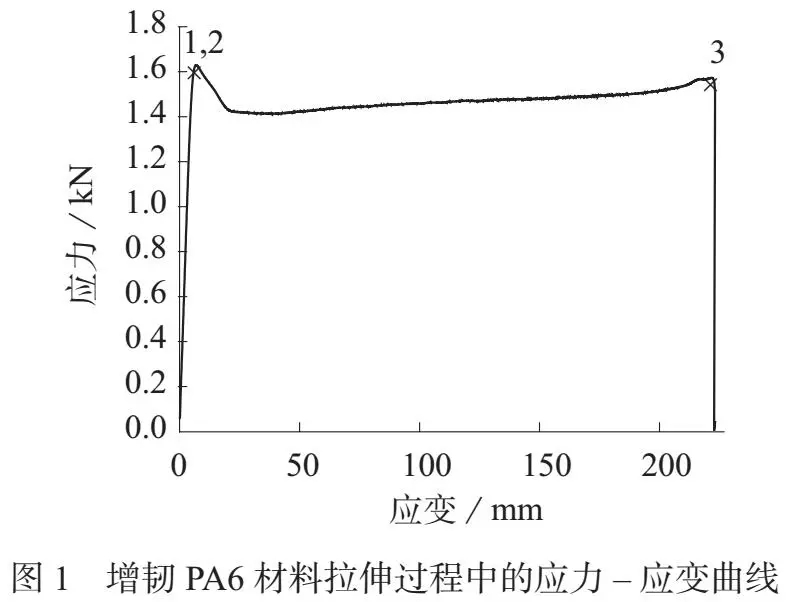 ????????斷裂強度在增韌PA6 材料拉伸曲線中的位置如圖1 中的3 點所示。從表1 可看到,一次擠出過程得到的增韌PA6 材料斷裂強度為48.18 MPa,經過二次擠出過程后,增韌PA6 材料的斷裂強度下降到40.78 MPa,這與2擠出工藝對增韌PA6 材料拉伸強度的影響十分相似,說明這一性能對擠出過程以及氧化降解缺陷非常敏感。