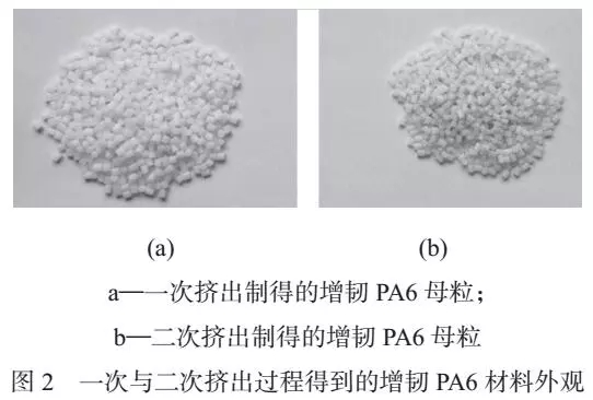 ????????在二次擠出過程中雖然加入了與一次過程等量的抗氧劑,但是增韌PA6 材料仍然發(fā)生了明顯的氧化現象,一次與二次擠出過程得到的增韌PA6 材料外觀如圖2 所示。從圖2 可以看到,二次擠出過程得到的增韌PA6 顆粒顏色明顯比一次擠出過程顆粒顏色深,說明二次擠出過程增韌PA6 材料發(fā)生了更多的氧化降解,因此二次擠出過程中得到的增韌PA6材料的拉伸強度更低。
