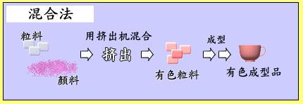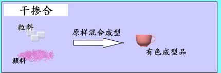 這種方法主要在注塑成型時(shí),把顏色溶度高的有色母料混合到著色材料中,主要用于黑灰色產(chǎn)品著色。