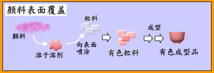把溶有顏料的涂料噴涂在粒料表面進(jìn)行覆蓋,可以輕而易舉進(jìn)行著色,廣泛滿足用戶的需求。但是與混合法相比,顏料的分散性差一些。