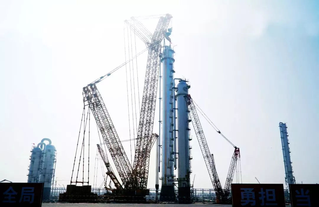 ????????目前,乙烯裝置急冷水塔、急冷油塔、乙烯塔、1#丙烯塔和2#丙烯塔5個(gè)超千噸級(jí)大型設(shè)備陸續(xù)順利吊裝就位,標(biāo)志著項(xiàng)目乙烯裝置建設(shè)取得階段性勝利,設(shè)備安裝工作將迎來新一輪高峰。