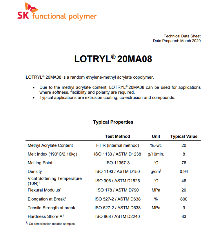 - 阿科瑪增韌劑相容劑EMA Lotryl 20MA08 物性表, 阿科瑪增韌劑相容劑EMA Lotryl 20MA08 產(chǎn)品參數(shù),阿科瑪增韌劑相容劑EMA Lotryl 20MA08 性能表,阿科瑪增韌劑相容劑EMA Lotryl 20MA08 出廠報告, MSDS,, 物質(zhì)安全資料表, UL黃卡,{ SGS報告, RoHS, 食品級認(rèn)證, NSF飲用水標(biāo)準(zhǔn), 產(chǎn)品資料, 產(chǎn)品性能, 出廠報告, 原廠原包, 代理商, 熱變形溫度, 熔指數(shù), 流動系數(shù), 抗沖擊性能、沖擊強度, 低溫韌性、低溫抗沖擊性能, 熔體流動系數(shù)、熔體流動速率, 加工工藝、加工參數(shù)、加工溫度, 歐盟RoHS 德國FDA 美國FDA 日本FDA