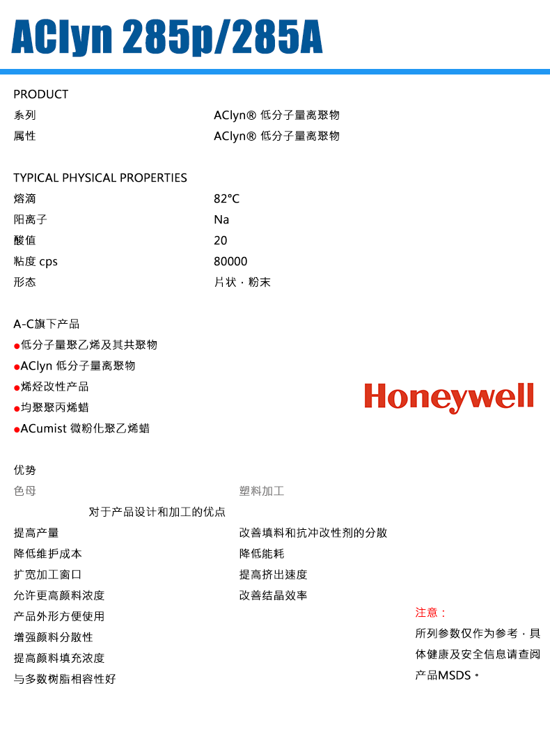 - 霍尼韋爾EAA離聚物蠟粉AClyn® 285P 結(jié)晶成核劑 物性表, 霍尼韋爾EAA離聚物蠟粉AClyn® 285P 結(jié)晶成核劑 產(chǎn)品參數(shù),霍尼韋爾EAA離聚物蠟粉AClyn® 285P 結(jié)晶成核劑 性能表,霍尼韋爾EAA離聚物蠟粉AClyn® 285P 結(jié)晶成核劑 出廠報(bào)告, MSDS,, 物質(zhì)安全資料表, UL黃卡,{ SGS報(bào)告, RoHS, 食品級認(rèn)證, NSF飲用水標(biāo)準(zhǔn), 產(chǎn)品資料, 產(chǎn)品性能, 出廠報(bào)告, 原廠原包, 代理商, 熱變形溫度, 熔指數(shù), 流動(dòng)系數(shù), 抗沖擊性能、沖擊強(qiáng)度, 低溫韌性、低溫抗沖擊性能, 熔體流動(dòng)系數(shù)、熔體流動(dòng)速率, 加工工藝、加工參數(shù)、加工溫度, 歐盟RoHS 德國FDA 美國FDA 日本FDA