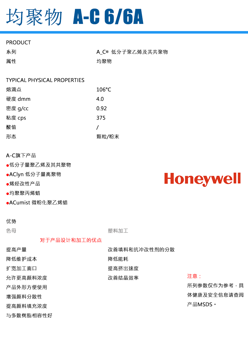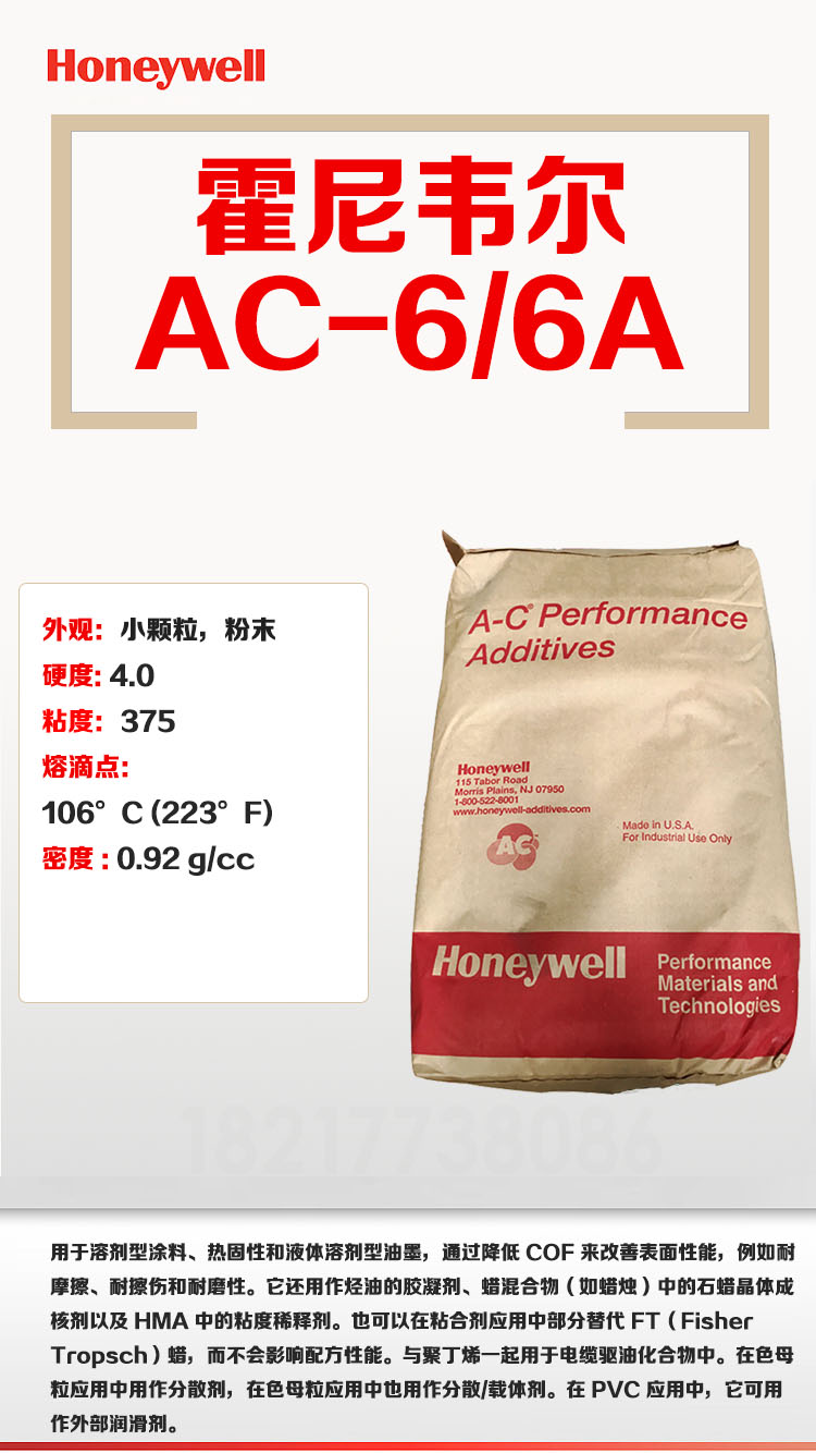 - 美國(guó)霍尼韋爾 HONEYWELL AC-6A 低分子聚乙烯蠟 物性表, 美國(guó)霍尼韋爾 HONEYWELL AC-6A 低分子聚乙烯蠟 產(chǎn)品參數(shù),美國(guó)霍尼韋爾 HONEYWELL AC-6A 低分子聚乙烯蠟 性能表,美國(guó)霍尼韋爾 HONEYWELL AC-6A 低分子聚乙烯蠟 出廠報(bào)告, MSDS,, 物質(zhì)安全資料表, UL黃卡,{ SGS報(bào)告, RoHS, 食品級(jí)認(rèn)證, NSF飲用水標(biāo)準(zhǔn), 產(chǎn)品資料, 產(chǎn)品性能, 出廠報(bào)告, 原廠原包, 代理商, 熱變形溫度, 熔指數(shù), 流動(dòng)系數(shù), 抗沖擊性能、沖擊強(qiáng)度, 低溫韌性、低溫抗沖擊性能, 熔體流動(dòng)系數(shù)、熔體流動(dòng)速率, 加工工藝、加工參數(shù)、加工溫度, 歐盟RoHS 德國(guó)FDA 美國(guó)FDA 日本FDA