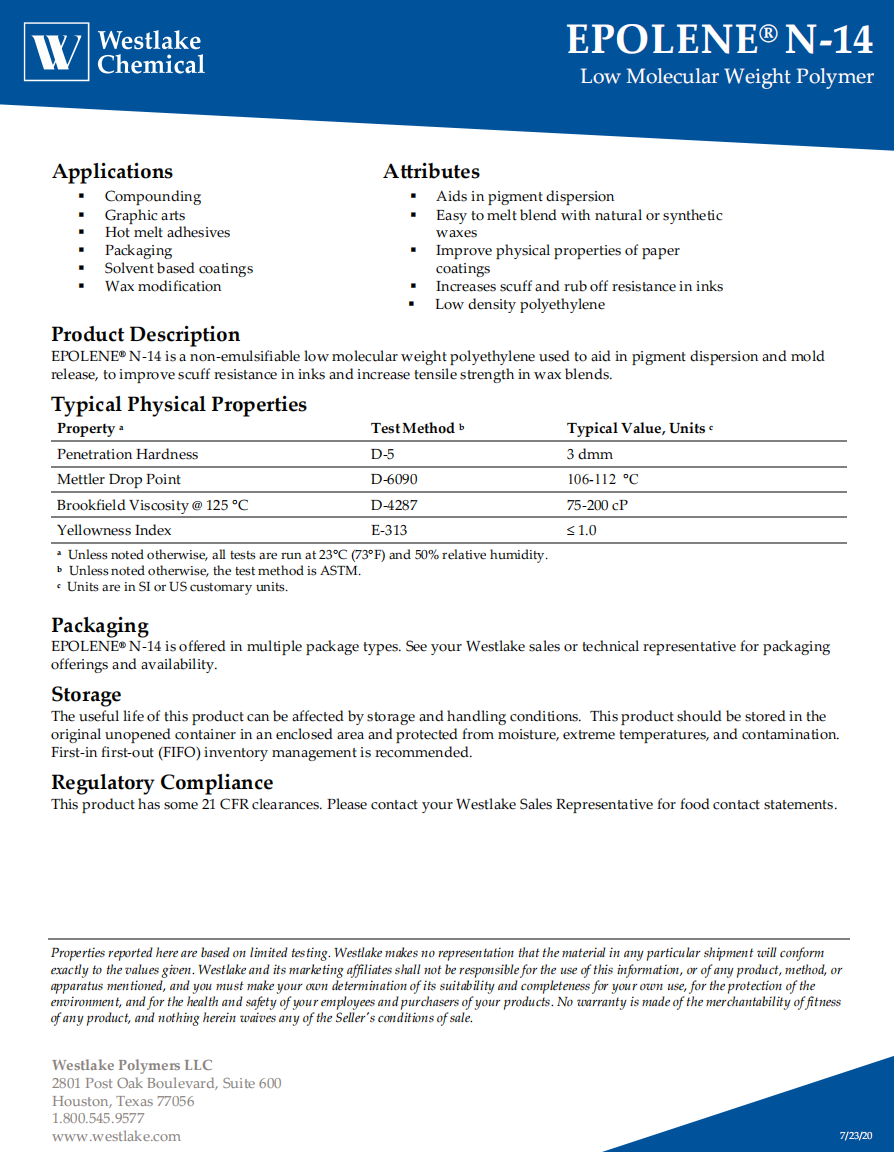- 美國西湖化學(xué)WESTLAKEN14 聚乙烯蠟 N-14 物性表, 美國西湖化學(xué)WESTLAKEN14 聚乙烯蠟 N-14 產(chǎn)品參數(shù),美國西湖化學(xué)WESTLAKEN14 聚乙烯蠟 N-14 性能表,美國西湖化學(xué)WESTLAKEN14 聚乙烯蠟 N-14 出廠報(bào)告, MSDS,, 物質(zhì)安全資料表, UL黃卡,{ SGS報(bào)告, RoHS, 食品級認(rèn)證, NSF飲用水標(biāo)準(zhǔn), 產(chǎn)品資料, 產(chǎn)品性能, 出廠報(bào)告, 原廠原包, 代理商, 熱變形溫度, 熔指數(shù), 流動系數(shù), 抗沖擊性能、沖擊強(qiáng)度, 低溫韌性、低溫抗沖擊性能, 熔體流動系數(shù)、熔體流動速率, 加工工藝、加工參數(shù)、加工溫度, 歐盟RoHS 德國FDA 美國FDA 日本FDA