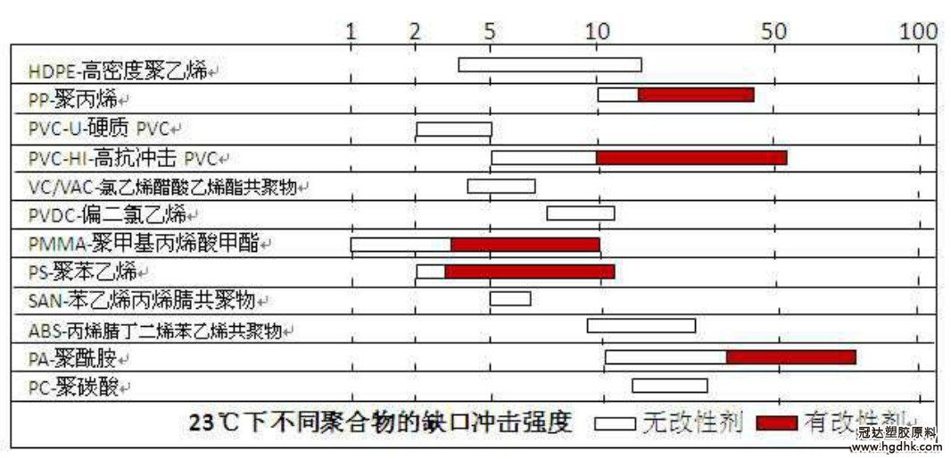 從上圖可見(jiàn) PA 的抗沖擊性能最好;其次是 PC。PP、PVC-HI、PMMA、PS、PA 添加沖擊改性劑后,抗沖擊性能大大提高。ABS、PA、PC 即使不加抗充擊改性劑 的抗沖擊性能也較大。其中 PMMA 和 PC 都是透明材料,PMMA 的剛性好,脆;PC 的韌性好,不脆。無(wú)改性劑的 PS 抗沖擊性能較差,我們?cè)?jīng)為客戶(hù)測(cè)試過(guò)加入改 性劑的 PS 產(chǎn)品,抗沖擊性能提高許多。 沖擊改性劑的品種很多,常用的有 ACR-丙烯酸酯類(lèi)樹(shù)脂、MBS-甲基丙烯酸甲酯-丁二烯-苯乙烯共聚物、CPE-氯化聚乙烯、ABS、EVA、EPT-三元乙丙膠等。 從制品的改性效果來(lái)看,ACR 是綜合性能最好的一類(lèi),MBS 是透明制品重要的沖擊改性劑,在全球沖擊改性劑市場(chǎng)中占有重要地位。