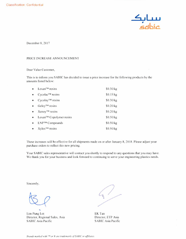 鉅衍塑化小編通知大家,SABIC官方漲價(jià)函如圖所示: