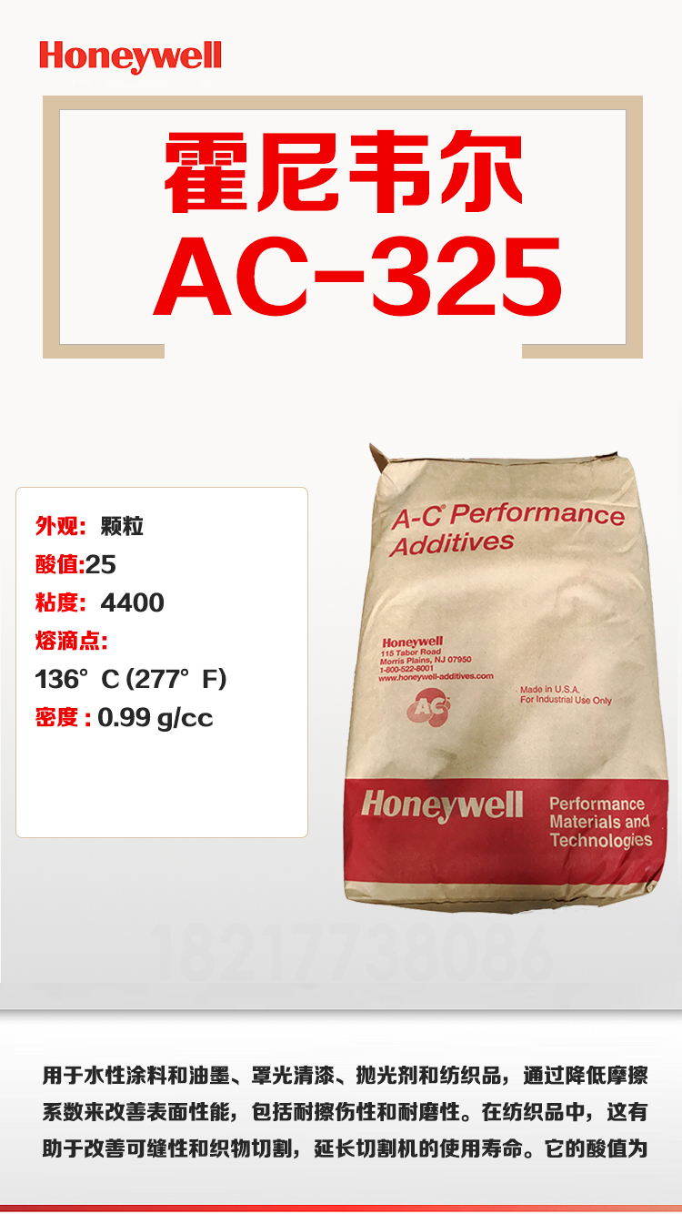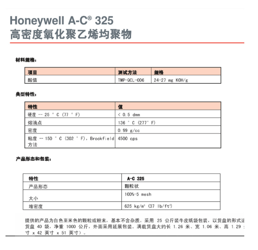 • Honeywell霍尼韋爾氧化聚乙烯蠟 A-C 325 蠟粉 酸值高易乳化 物性表, Honeywell霍尼韋爾氧化聚乙烯蠟 A-C 325 蠟粉 酸值高易乳化 產(chǎn)品參數(shù),Honeywell霍尼韋爾氧化聚乙烯蠟 A-C 325 蠟粉 酸值高易乳化 性能表,Honeywell霍尼韋爾氧化聚乙烯蠟 A-C 325 蠟粉 酸值高易乳化 出廠報告, MSDS,, 物質(zhì)安全資料表, UL黃卡,{ SGS報告, RoHS, 食品級認證, NSF飲用水標準, 產(chǎn)品資料, 產(chǎn)品性能, 出廠報告, 原廠原包, 代理商, 熱變形溫度, 熔指數(shù), 流動系數(shù), 抗沖擊性能、沖擊強度, 低溫韌性、低溫抗沖擊性能, 熔體流動系數(shù)、熔體流動速率, 加工工藝、加工參數(shù)、加工溫度, 歐盟RoHS 德國FDA 美國FDA 日本FDA