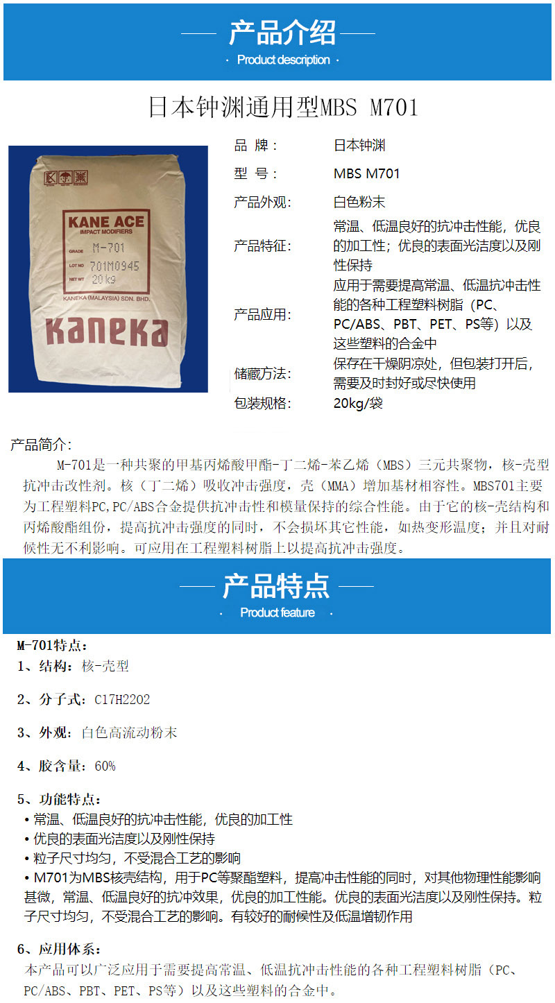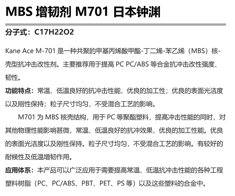 - 日本鐘淵MBS M701增韌劑 PC/ABS合金抗沖擊劑 增韌改性鐘淵mbs701 物性表, 日本鐘淵MBS M701增韌劑 PC/ABS合金抗沖擊劑 增韌改性鐘淵mbs701 產(chǎn)品參數(shù),日本鐘淵MBS M701增韌劑 PC/ABS合金抗沖擊劑 增韌改性鐘淵mbs701 性能表,日本鐘淵MBS M701增韌劑 PC/ABS合金抗沖擊劑 增韌改性鐘淵mbs701 出廠報(bào)告, MSDS,, 物質(zhì)安全資料表, UL黃卡,{ SGS報(bào)告, RoHS, 食品級(jí)認(rèn)證, NSF飲用水標(biāo)準(zhǔn), 產(chǎn)品資料, 產(chǎn)品性能, 出廠報(bào)告, 原廠原包, 代理商, 熱變形溫度, 熔指數(shù), 流動(dòng)系數(shù), 抗沖擊性能、沖擊強(qiáng)度, 低溫韌性、低溫抗沖擊性能, 熔體流動(dòng)系數(shù)、熔體流動(dòng)速率, 加工工藝、加工參數(shù)、加工溫度, 歐盟RoHS 德國FDA 美國FDA 日本FDA