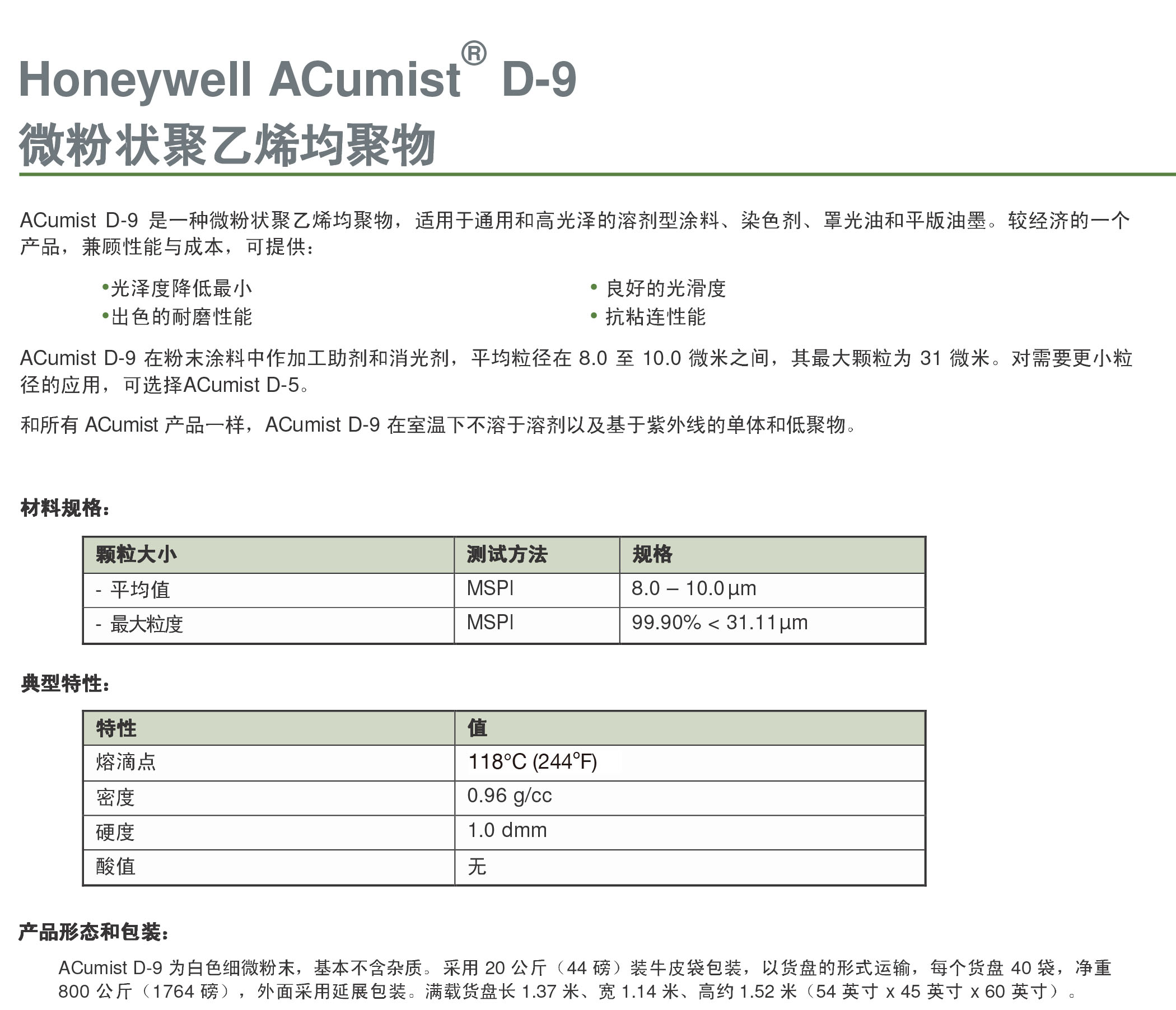 ACumist D-9 是一種微粉狀聚乙烯均聚物,適用于通用和高光澤的溶劑型涂料、染色劑、罩光油和平版油墨。較經(jīng)濟的一個產(chǎn)品,兼顧性能與成本,可提供:?光澤度降低最小? 良好的光滑度?出色的耐磨性能? 抗粘連性能