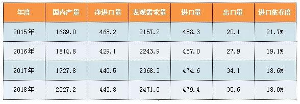 ????????2018年國(guó)內(nèi)聚丙烯粒料產(chǎn)量2027萬(wàn),進(jìn)口量479萬(wàn)噸,出口量36萬(wàn)噸,表觀消費(fèi)量2471萬(wàn)噸,比2017年增加103萬(wàn)噸,增長(zhǎng)4.3%;進(jìn)口依存度18.0%,比2017年下降0.6個(gè)百分點(diǎn)。