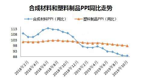 ????????10月份,化學原料和化學品制造業(yè)增加值同比增長3%,橡膠和塑料制品業(yè)增加值同比增長3.9%,顯然下游制品業(yè)增速還是快于上游原料,兩者增速差連續(xù)三個月收窄,源于10月份制品業(yè)下降速度快于原料。去年10月份PE、PP等塑料原料價格揭開下滑序幕,橡塑制品的增速明顯低于原料,總體看隨著原料端價格下跌,終端產(chǎn)品成本降低,從塑料制品增長角度看制品行業(yè)目前形勢略好于去年。
