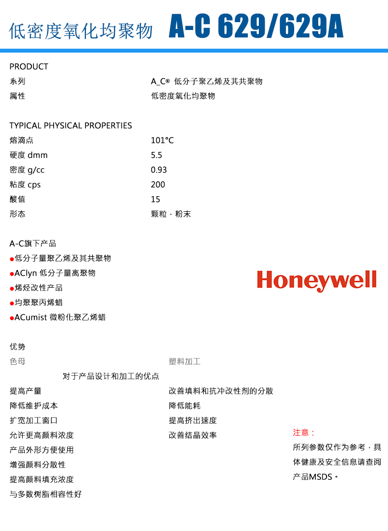 - 美國霍尼韋爾 honeywell 氧化聚乙烯蠟 AC 629 物性表, 美國霍尼韋爾 honeywell 氧化聚乙烯蠟 AC 629 產(chǎn)品參數(shù),美國霍尼韋爾 honeywell 氧化聚乙烯蠟 AC 629 性能表,美國霍尼韋爾 honeywell 氧化聚乙烯蠟 AC 629 出廠報(bào)告, MSDS,, 物質(zhì)安全資料表, UL黃卡,{ SGS報(bào)告, RoHS, 食品級認(rèn)證, NSF飲用水標(biāo)準(zhǔn), 產(chǎn)品資料, 產(chǎn)品性能, 出廠報(bào)告, 原廠原包, 代理商, 熱變形溫度, 熔指數(shù), 流動(dòng)系數(shù), 抗沖擊性能、沖擊強(qiáng)度, 低溫韌性、低溫抗沖擊性能, 熔體流動(dòng)系數(shù)、熔體流動(dòng)速率, 加工工藝、加工參數(shù)、加工溫度, 歐盟RoHS 德國FDA 美國FDA 日本FDA