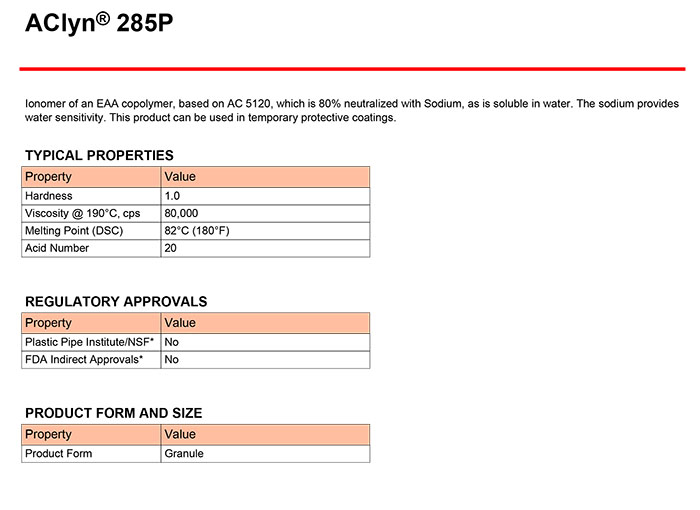 - 霍尼韋爾EAA離聚物蠟粉AClyn® 285P 結(jié)晶成核劑 物性表, 霍尼韋爾EAA離聚物蠟粉AClyn® 285P 結(jié)晶成核劑 產(chǎn)品參數(shù),霍尼韋爾EAA離聚物蠟粉AClyn® 285P 結(jié)晶成核劑 性能表,霍尼韋爾EAA離聚物蠟粉AClyn® 285P 結(jié)晶成核劑 出廠報(bào)告, MSDS,, 物質(zhì)安全資料表, UL黃卡,{ SGS報(bào)告, RoHS, 食品級認(rèn)證, NSF飲用水標(biāo)準(zhǔn), 產(chǎn)品資料, 產(chǎn)品性能, 出廠報(bào)告, 原廠原包, 代理商, 熱變形溫度, 熔指數(shù), 流動(dòng)系數(shù), 抗沖擊性能、沖擊強(qiáng)度, 低溫韌性、低溫抗沖擊性能, 熔體流動(dòng)系數(shù)、熔體流動(dòng)速率, 加工工藝、加工參數(shù)、加工溫度, 歐盟RoHS 德國FDA 美國FDA 日本FDA